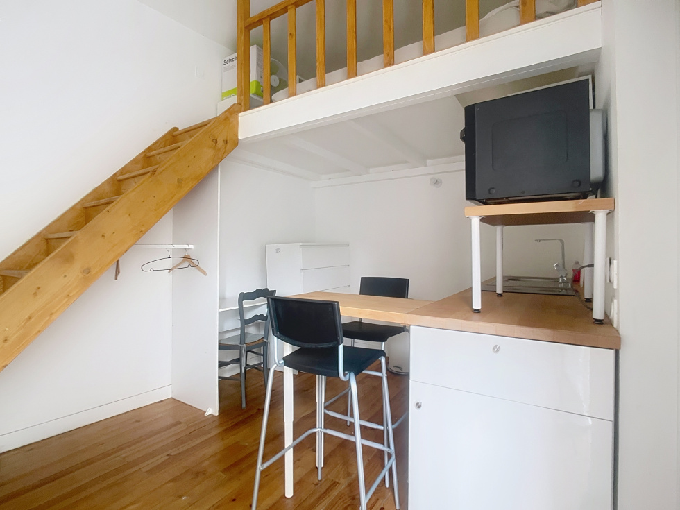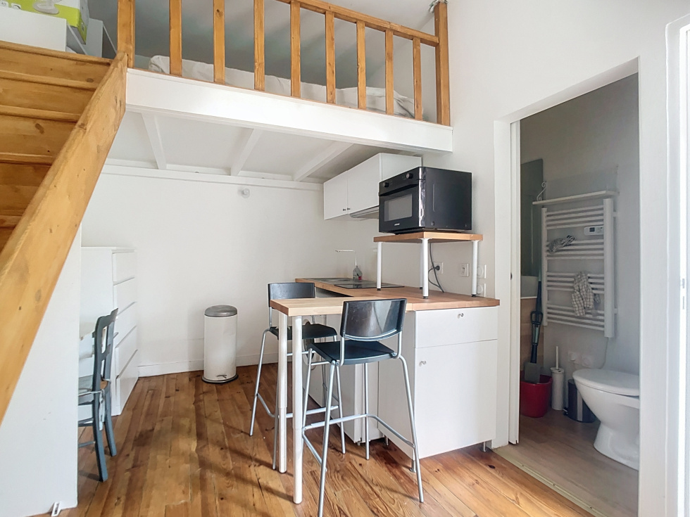Ce bien se compose d'un coin cuisine équipée avec plaques de cuisson, four, frigo, lave-linge et l'ensemble des éléments permettant de cuisiner, un coin bureau, une salle d'eau avec wc et un coin couchage en mezzanine.